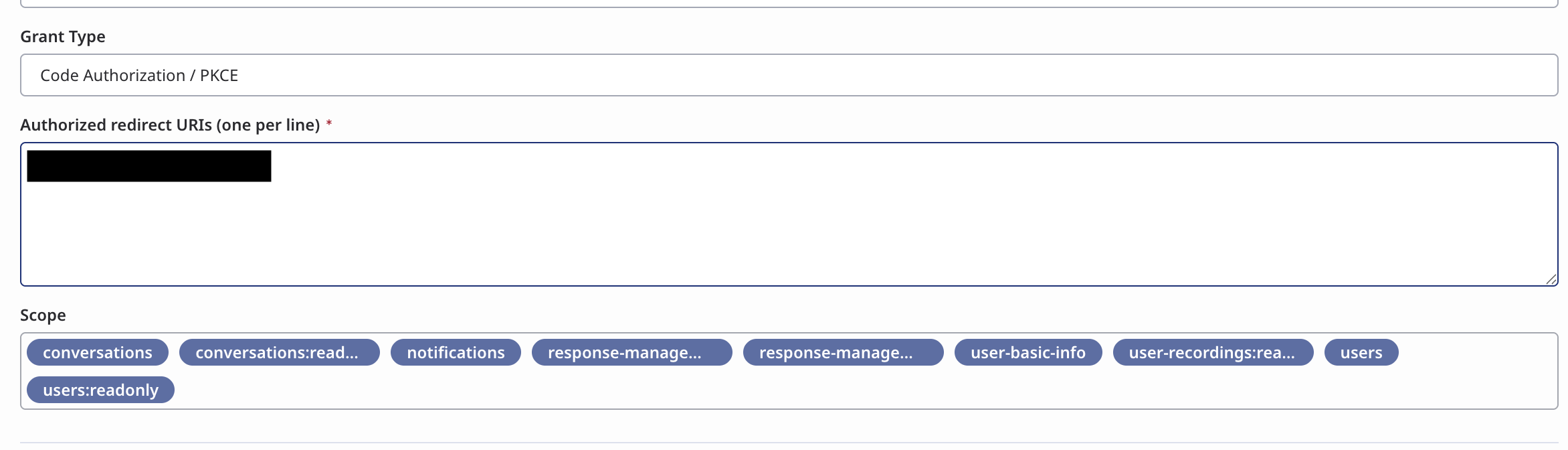 - Log in to your Genesys Cloud organization and create a new OAuth client that uses the Code Authorization / PKCE type. For more information, see Create an OAuth client in the Genesys Cloud Resource Center.