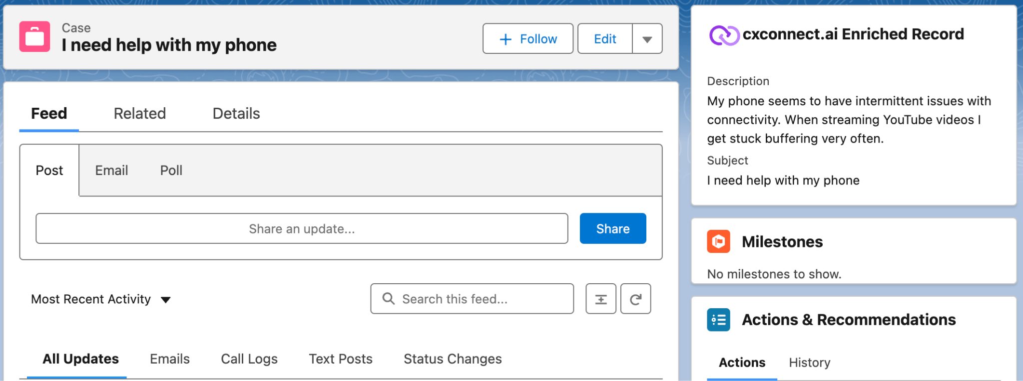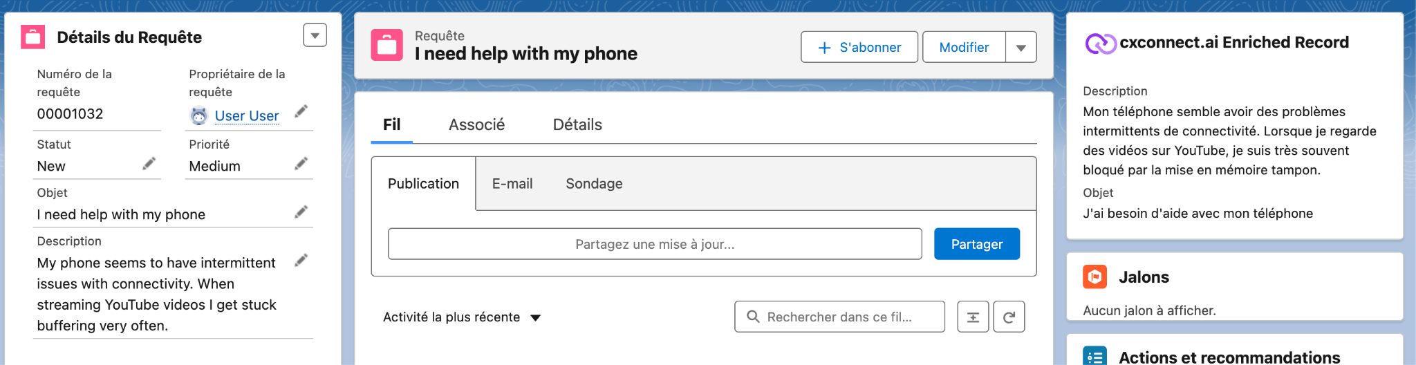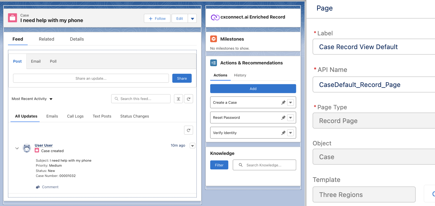 The cxconnect.ai Base application deploys with a custom component that can be added to any record page that is associated with a translation rule. Adding the Enriched: Record component to the Case record page allows Translations and other enrichments to be displayed.