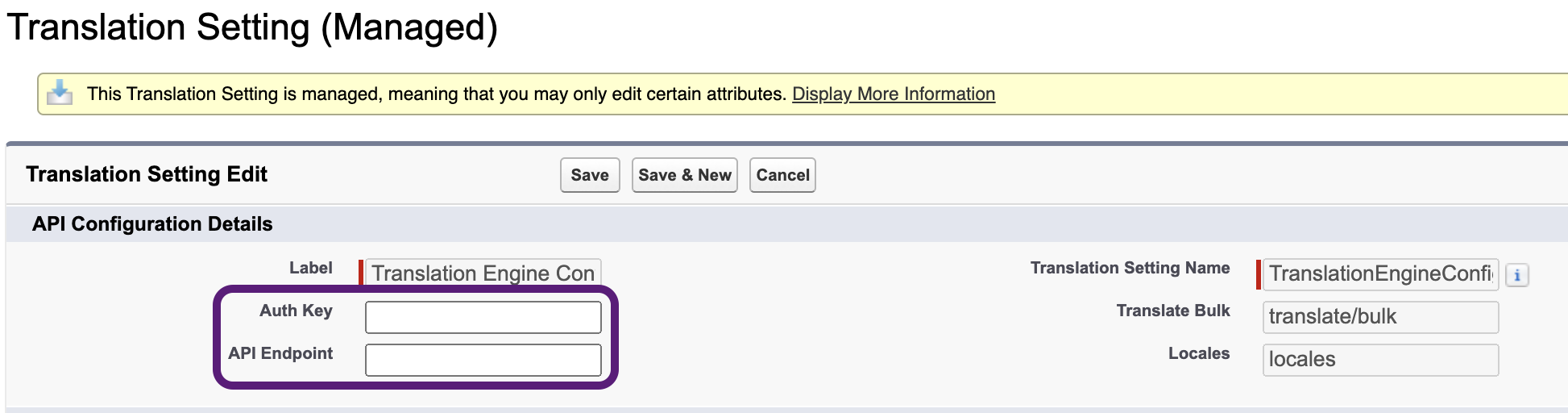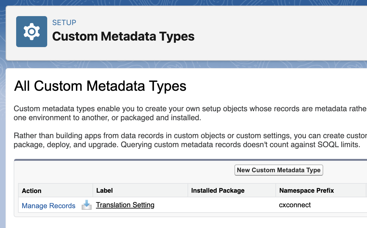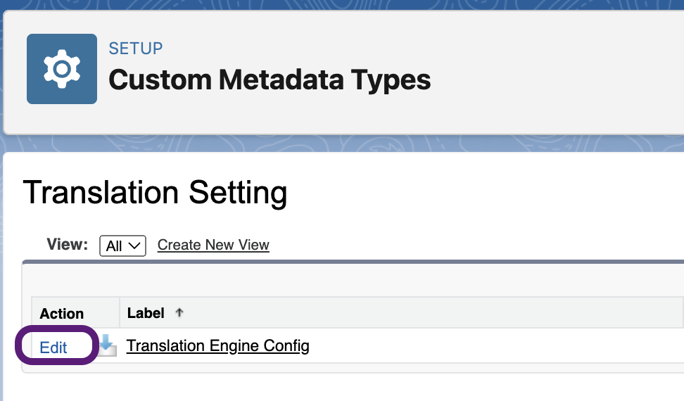 - Edit “Translation Engine Config” translation setting custom metadata record