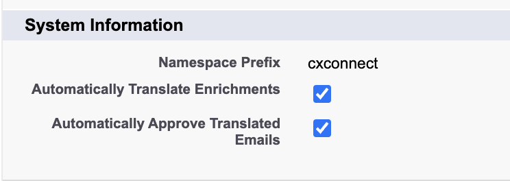 - cxconnect.ai User Permission Set Group: Includes all the permissions required for users using cxconnect.ai translation service.