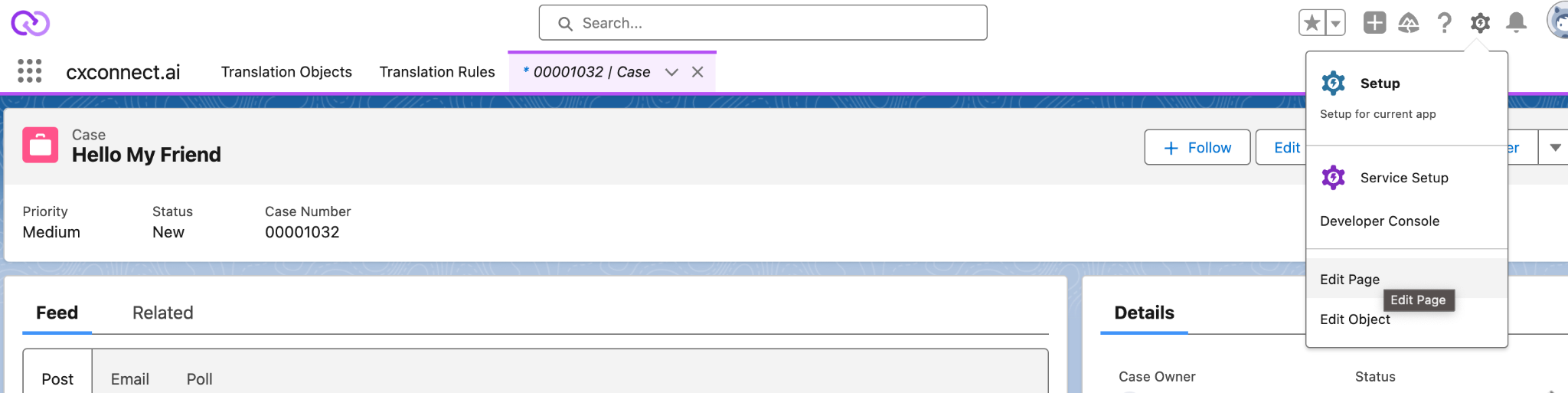 To add the cxconnect.ai Email Translator to your Case Lightning Record Page here are the steps to take:- Open the Record Page of the Case object to use this email component and click on Edit Page on the top setting widget