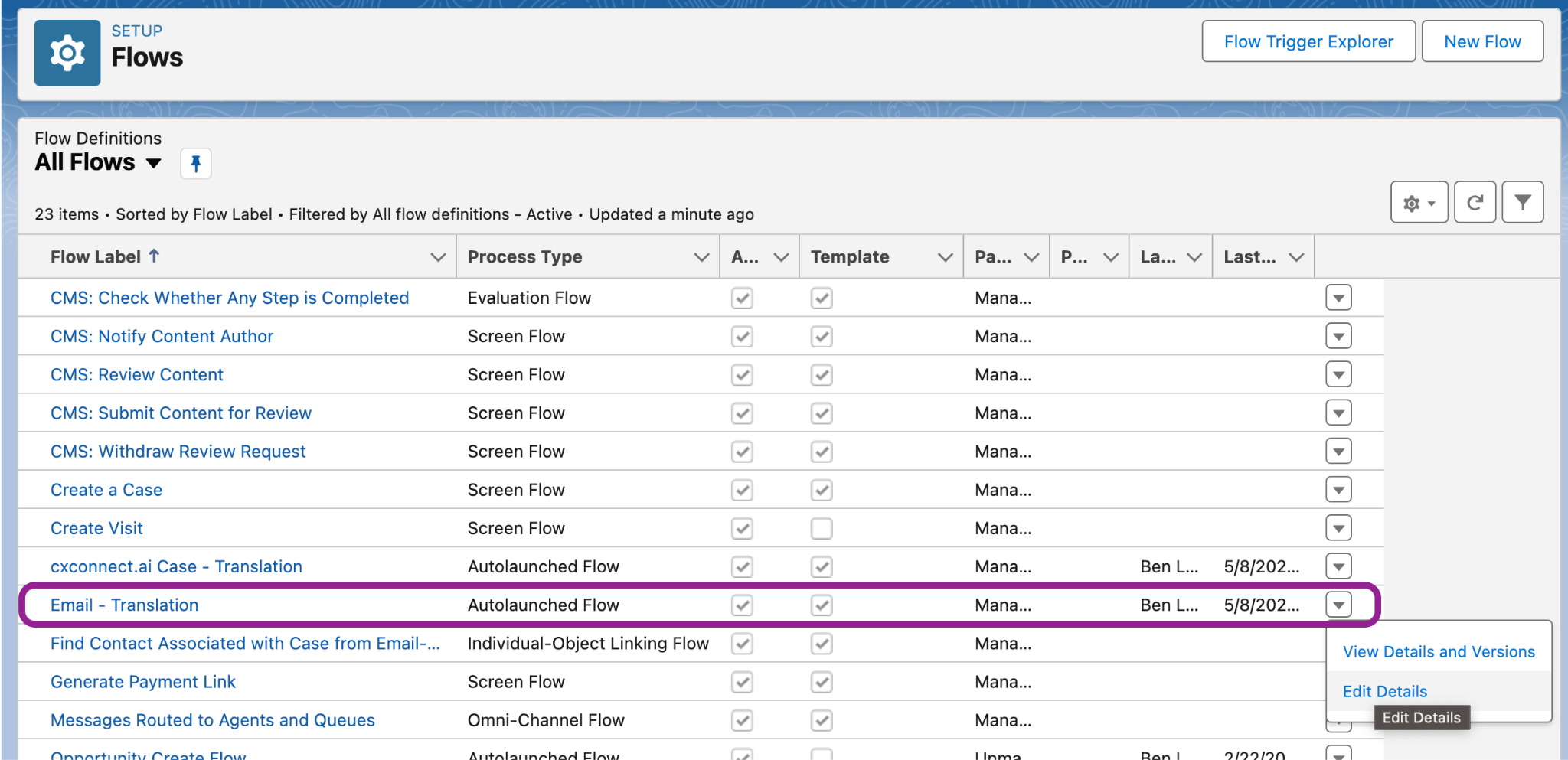 Setup a flow for each object you have enabled translation for by navigating to setup and then search for “Flows” in the search bar.