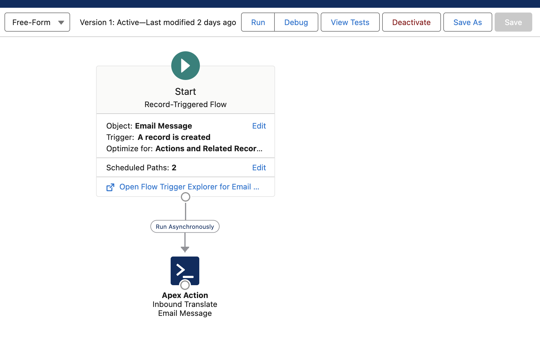 To assure your inbound emails are translated correctly a custom flow installs with the package that will translate emails as the flow in. Navigate to Setup -> Flows Find and click the Email - Translation Flow to view and activate.