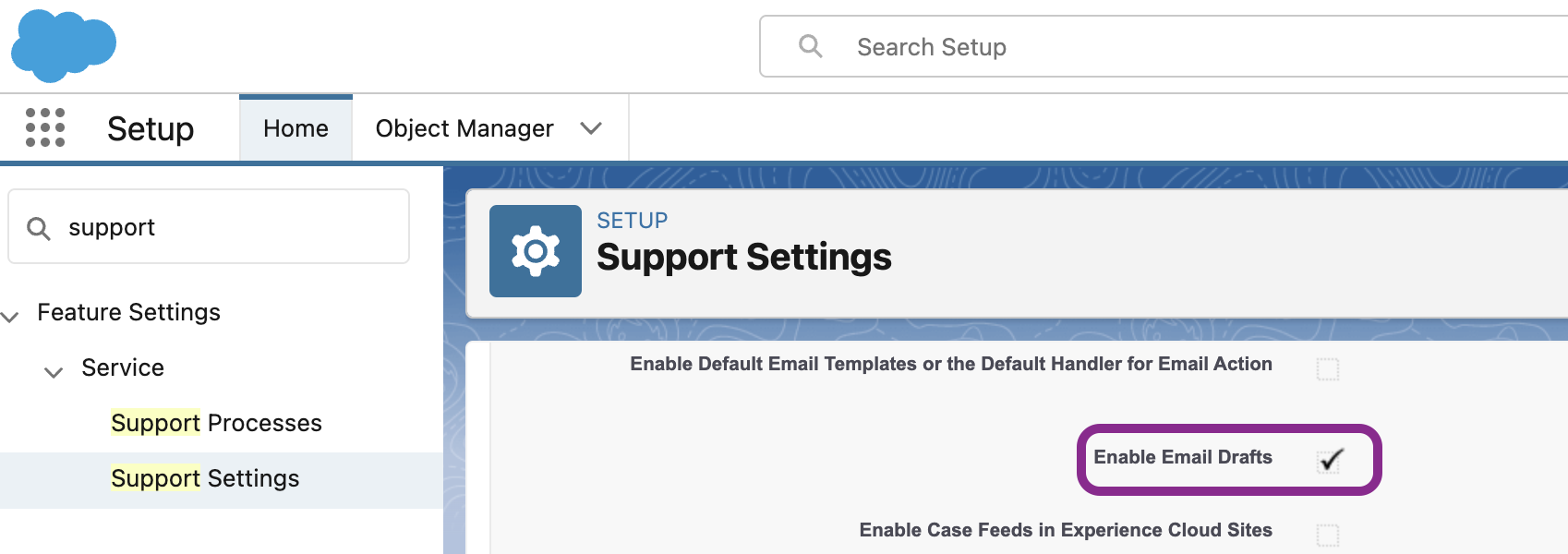 It’s required to Enable Email Drafts if not already enabled contained in Setup -> Support Settings. This allows cxconnect.ai to integrate fully with outbound email messages.