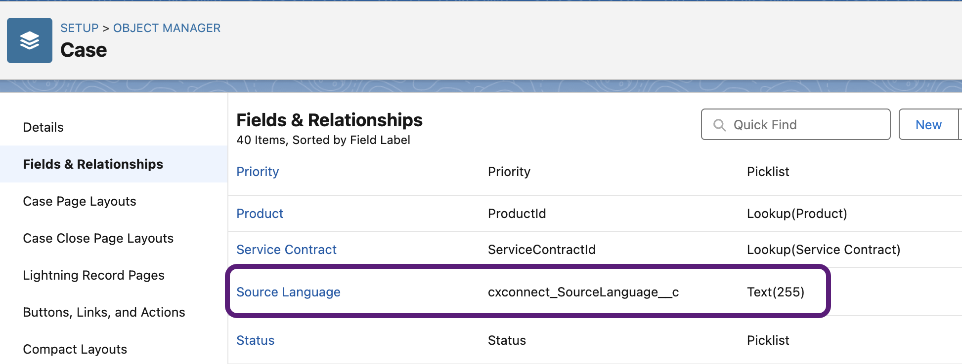 - After enabling translation for a Salesforce object, a new field called “Source Language” will be added to that object. To allow all user profiles to access the cxconnect.ai translation service, update the field level security settings.