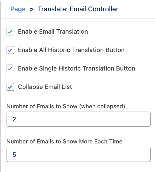 - Enable Single Historic Translation Button: enables or disables this button, which allows a user to translate a single untranslated email into their language