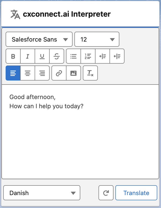 By adding the out-of-the-box cxconnect.ai component onto any flexi record page, cxconnect.ai Interpreter enables users to translate text in real time on any flexi page. Use cases making this feature valuable may include updating existing localized transcripts or editing any localized predictive texts in the local language. This feature can also be helpful to help with ad hoc translation needs outside the agent workflow. To add the cxconnect.ai Interpreter, follow the steps below.- Open any record page in Lightning