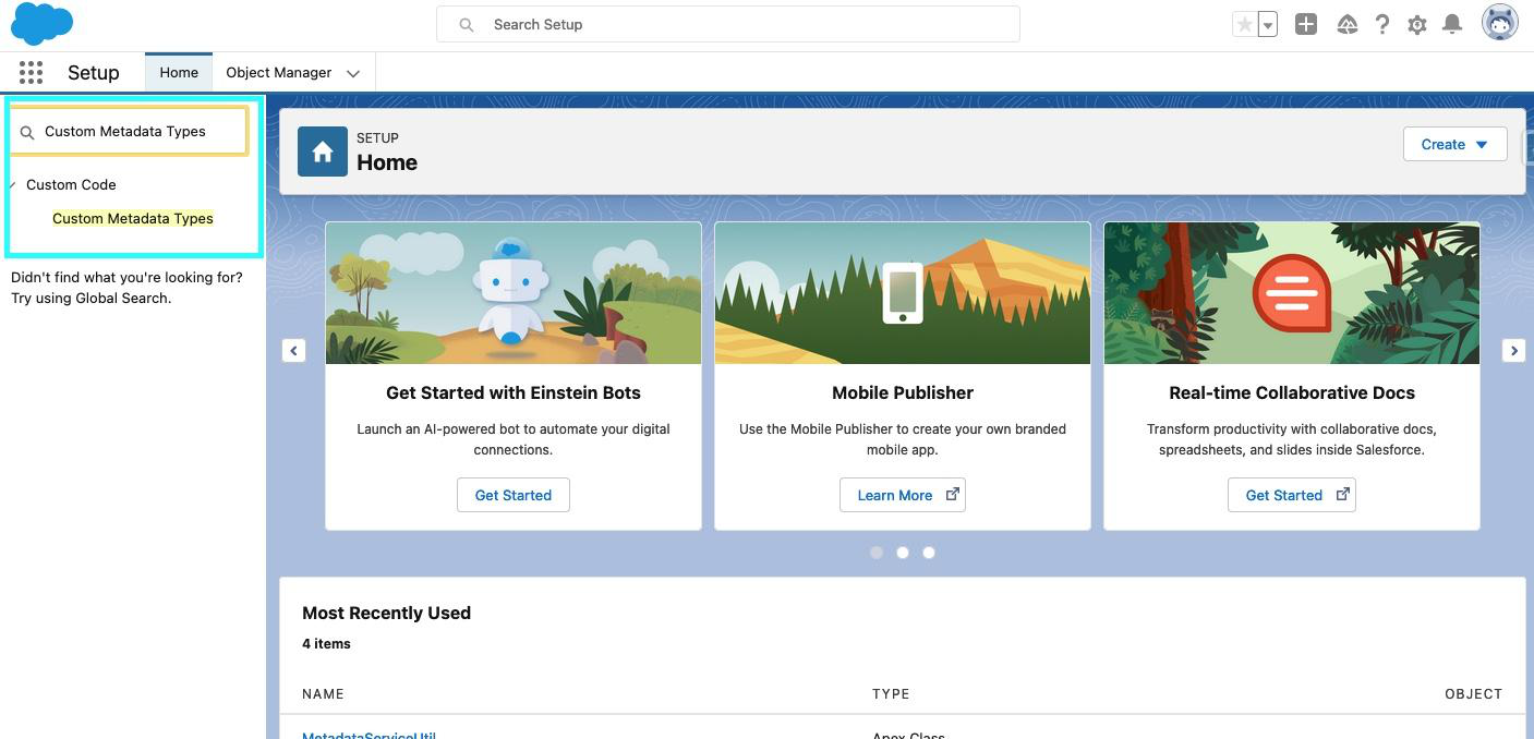 - From Setup, enter “Custom Metadata Types” in the Quick Find box, then select “Custom Metadata Types”
