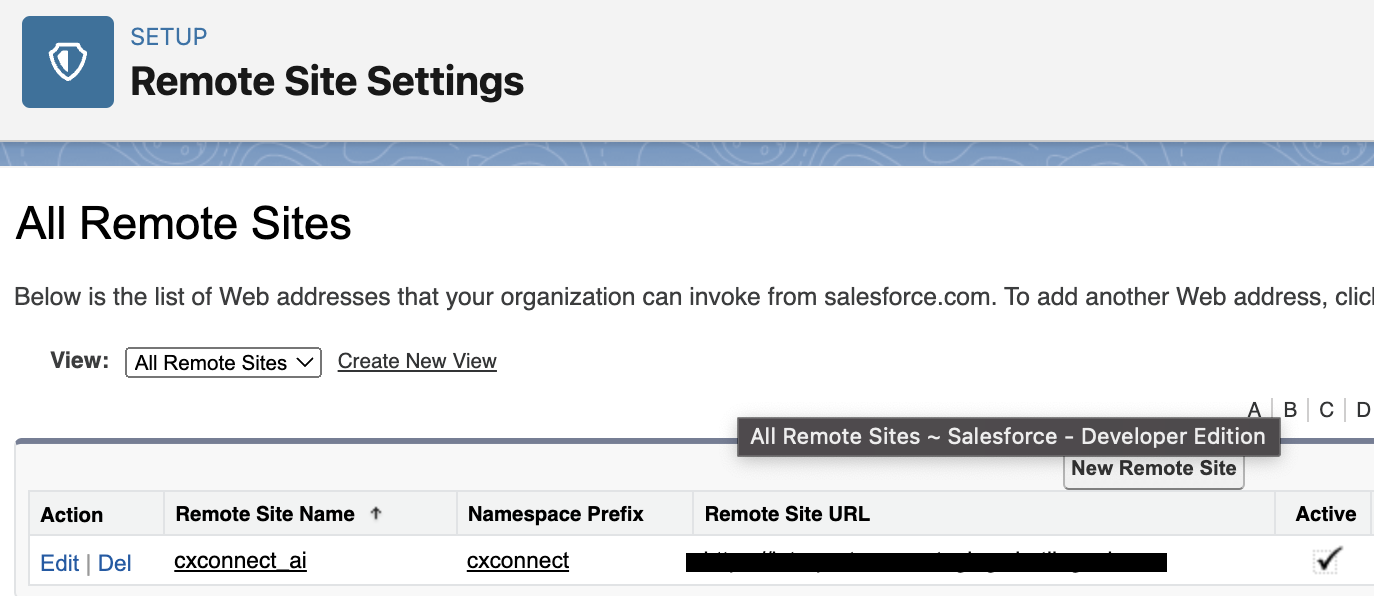 Add the given API Endpoint to remote site settings by navigating to Setup > Remote Site Settings > New Remote Site- Remote Site Name : cxconnect_ai (or something similar)