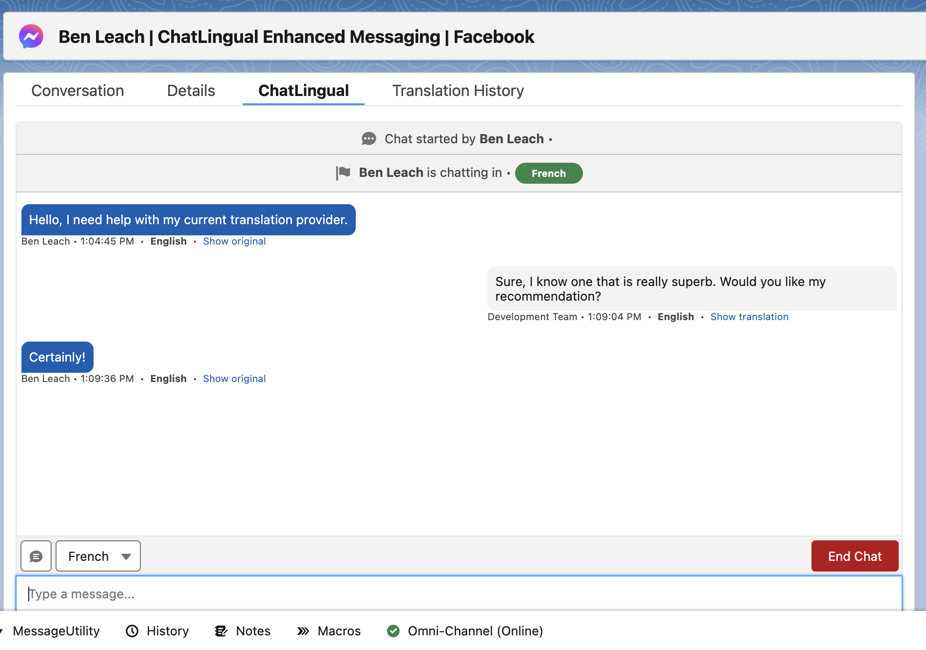 - Add Translation History to the Message Session Lightning Page.