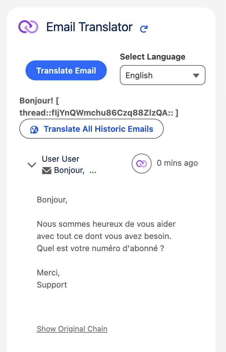 - If set by your administrator agents have the ability to translate all previous and/or individual emails with the click of a button.