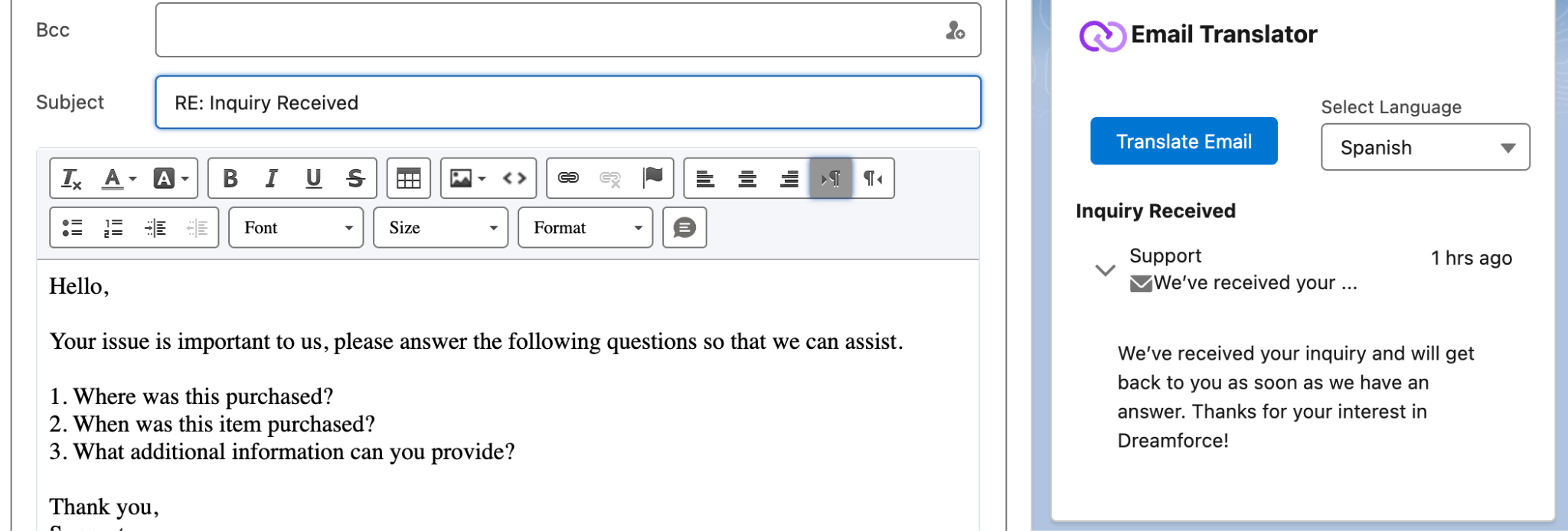 - Once a response has been drafted and a language is selected, clicking the “Translate Email” button will translate the response and (optionally) display a preview of the translated text.