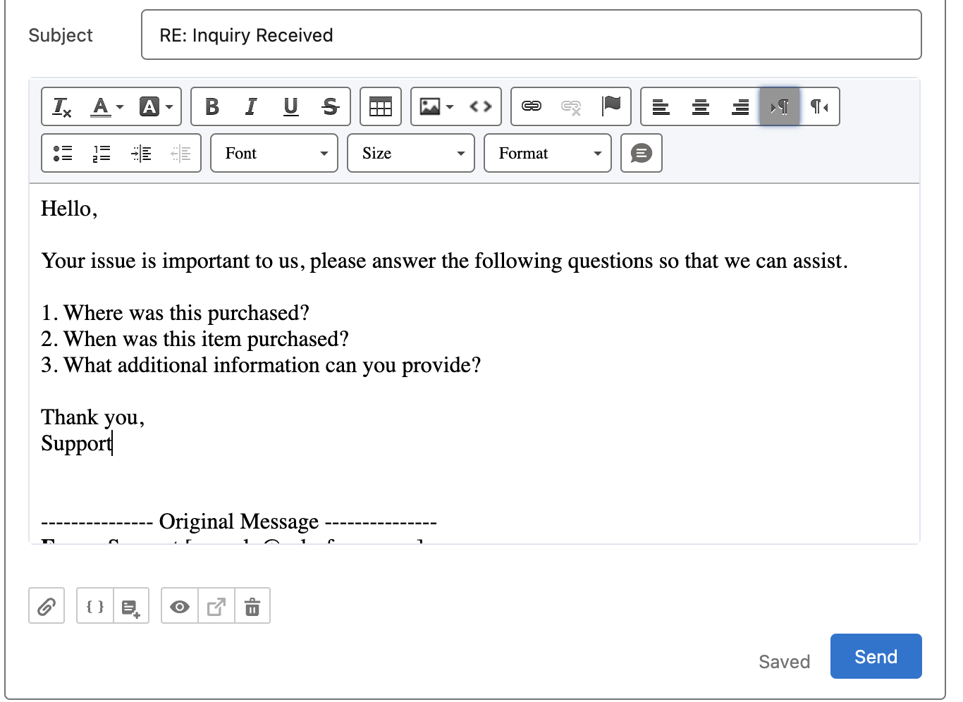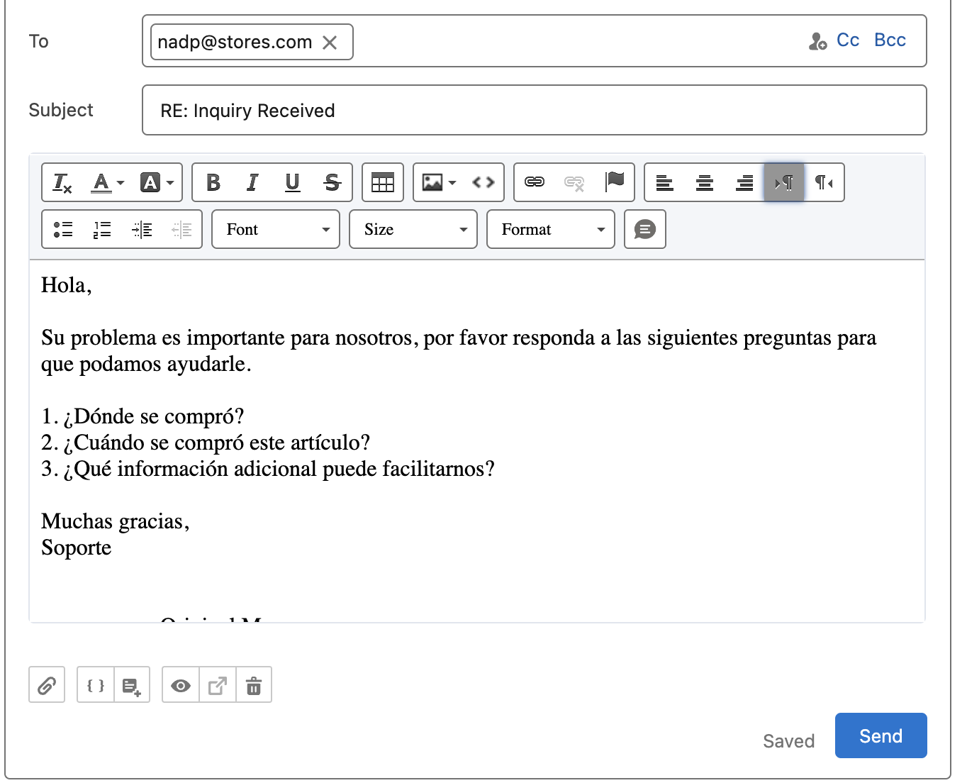 - Using the native email composer, an agent can respond in their response (this agent is using English).