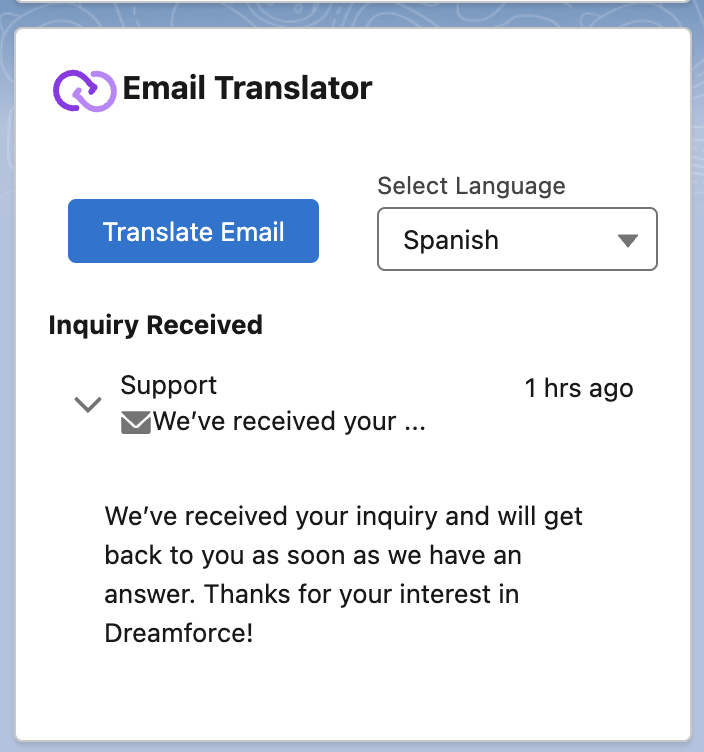 - The component displays, in descending order, the translated emails received and sent.