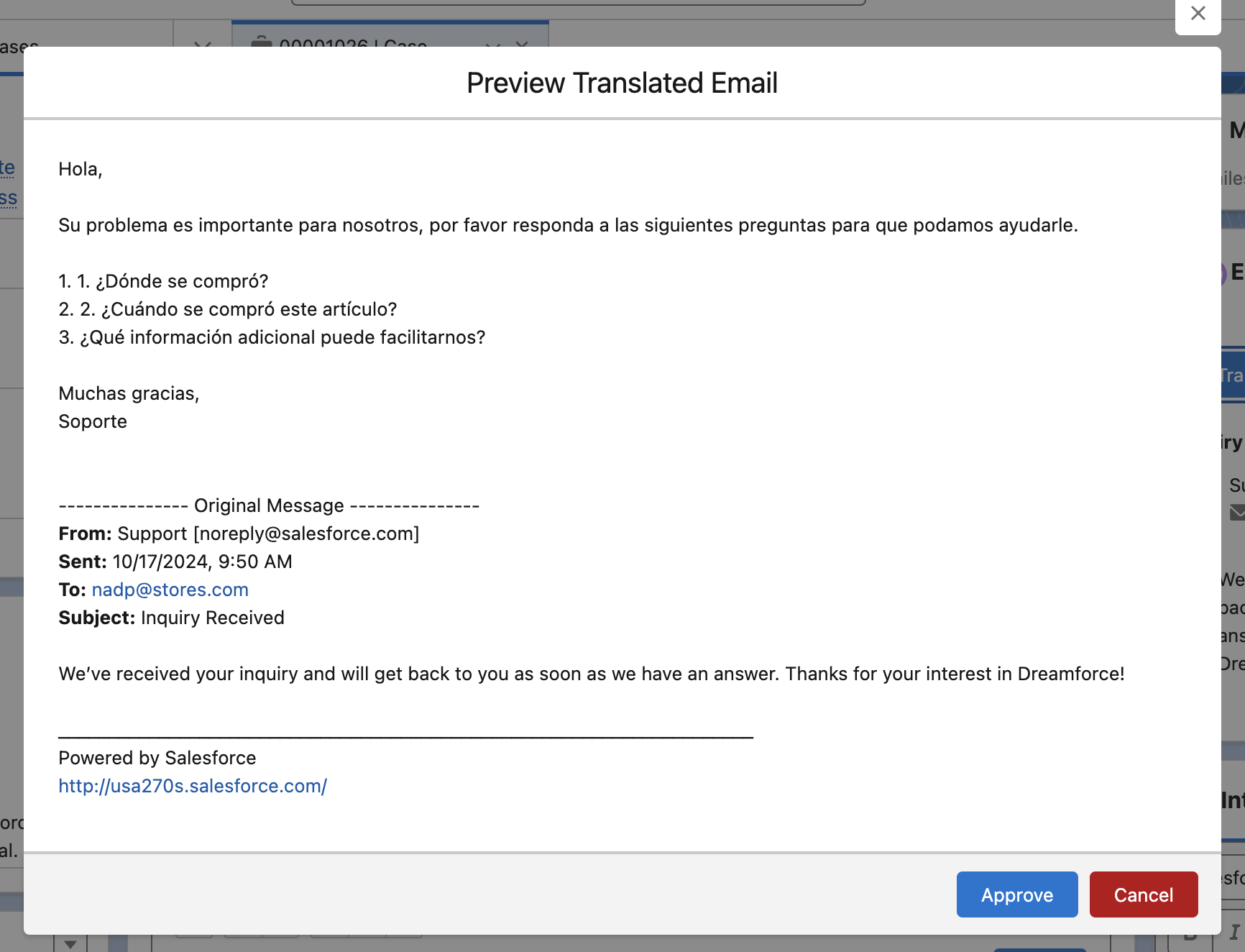 - If the agent is happy with the response, clicking “Approve” will update the email composer with the translated response. Clicking Cancel, or the “X” button, will simply close the preview without changing the composer.