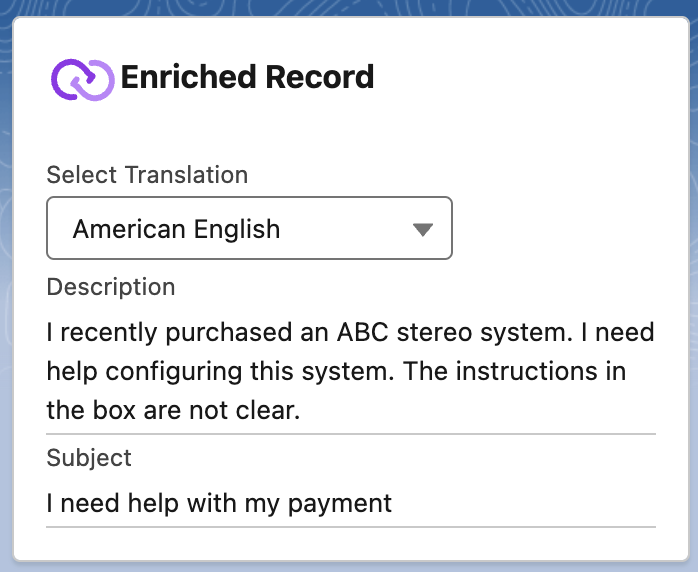 - When a user loads a record page where the Enriched Record component has been set up, they will see translations in their language, if they exist.