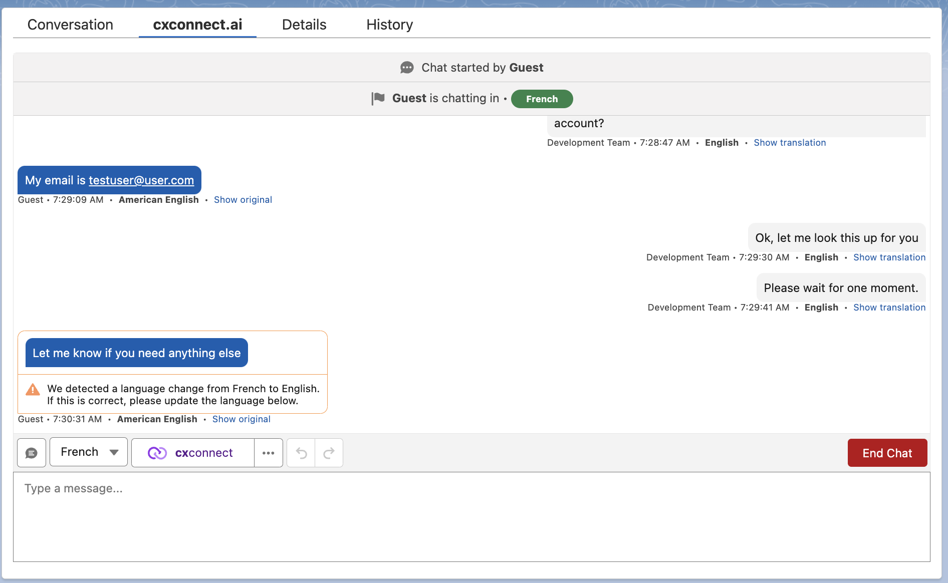 - If cxconnect detects a change in the language a small visible alert is placed on the message.